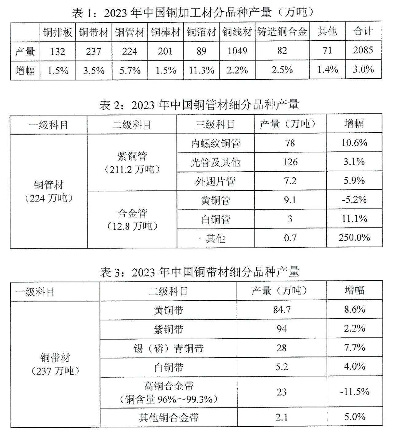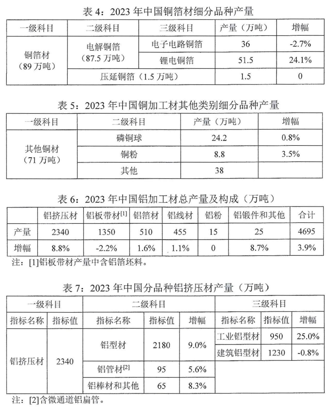 2023年,中國(guó)銅加工材綜合產(chǎn)量為2085萬(wàn)噸,比上年增長(zhǎng)3.0%。鋁加工材綜合產(chǎn)量為4695萬(wàn)噸,比上年增長(zhǎng)3.9%,其中剔除鋁箔坯料后的鋁加工材產(chǎn)量為4115萬(wàn)噸,比上年增長(zhǎng)4.2%。銅鋁加工材細(xì)分品種產(chǎn)量和鋁擠壓材表面處理方式構(gòu)成詳見(jiàn)下表1至表11。